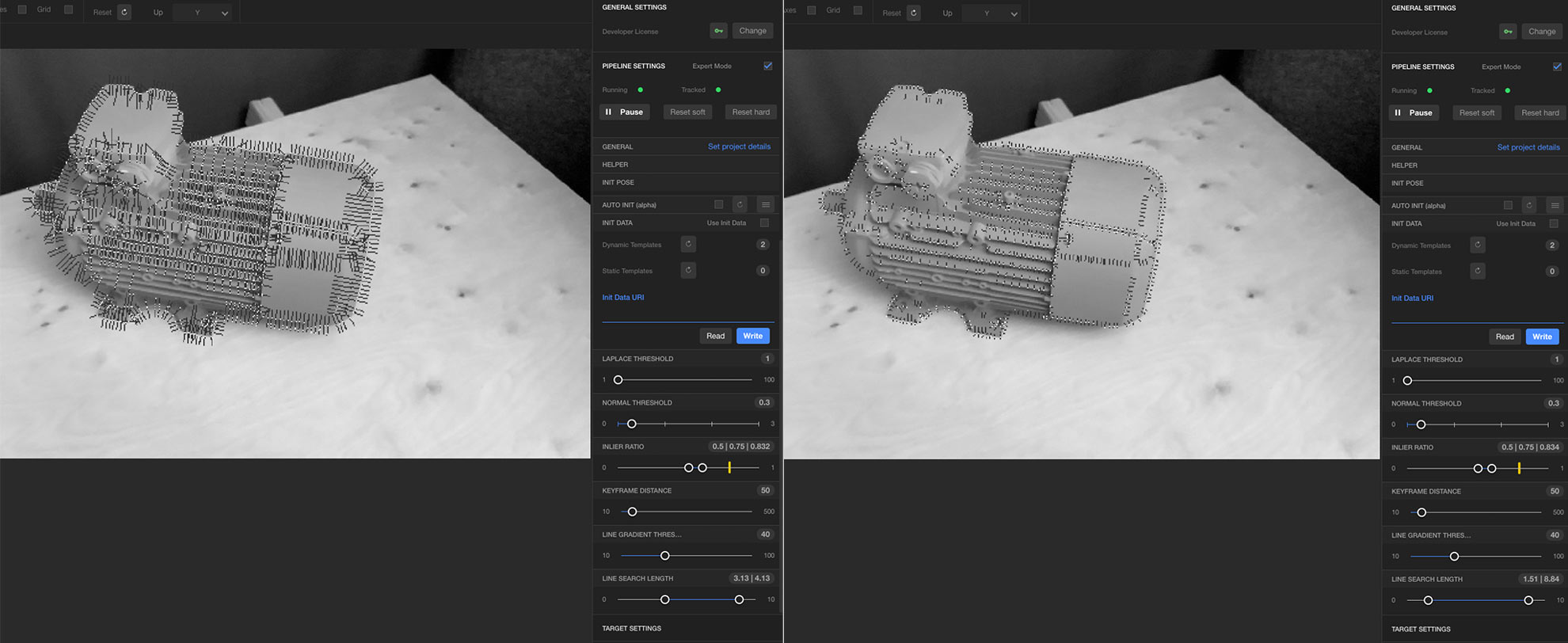 Before changing the tracking parameters, we encourage to test the defaults first. We recommend to use VisLab to explore their influence on tracking. In Unity, you can modify some of them via the example UI of the Advanced Model Tracking example scene.