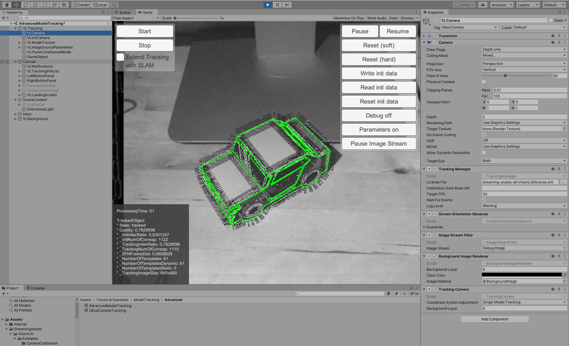 In case of debugging functionality, the AdvancedModelTracking is the most elaborate one. Here you can either load and test your custom tracking configuration, or as a developer, learn how VisionLib's VL components, scripts and prefabs are connected and used.
