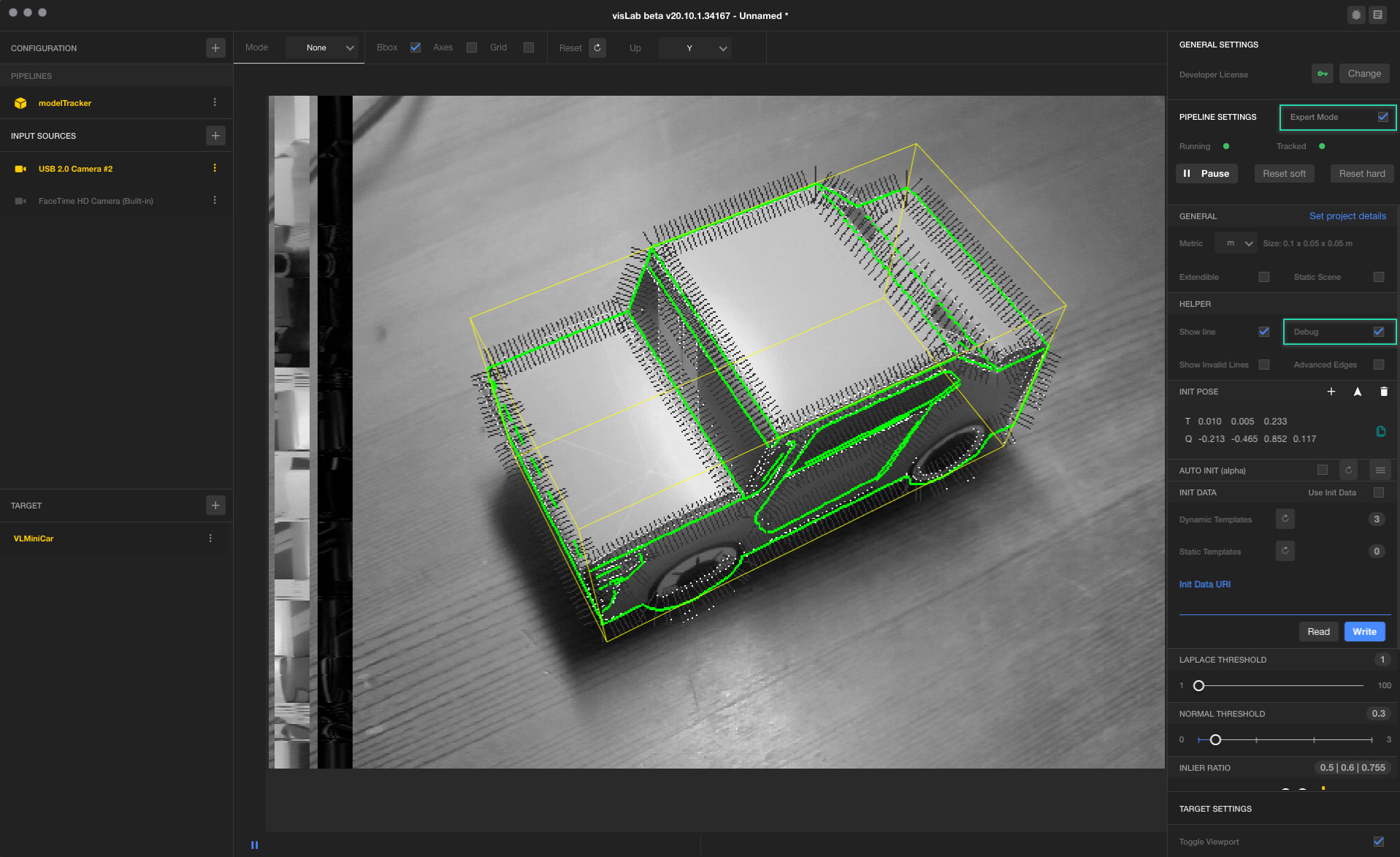Target panel.Expert Mode and select the Debug option.normal or laPlace threshold.normalThreshold: slide it slowly all the way up from its default 0.3 to see how the Line Model changes accordingly.laplaceThreshold and slide it slowly all the way up from its default 1.0.When debugging in Unity, we recommend to use the VisionLib's example scenes from the Unity SDK.