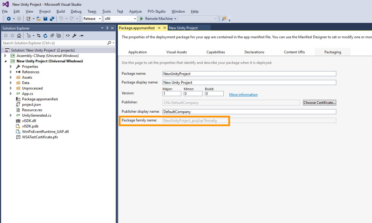Important: We sometimes experienced the problem that the certificate selected in Unity wasn't correctly selected in Visual Studio. This resulted in a displayed package family name which differed from the one used in the application. To overcome this issue please click Choose Certificate... and select the certificate you set in Unity.