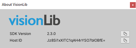 The host ID of the device that is running the Unity Editor is displayed in the About window in the VisionLib menu.